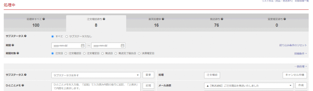 注文確認処理を行うと、行った注文情報は全て一度「楽天処理中」のステータスに移動します。