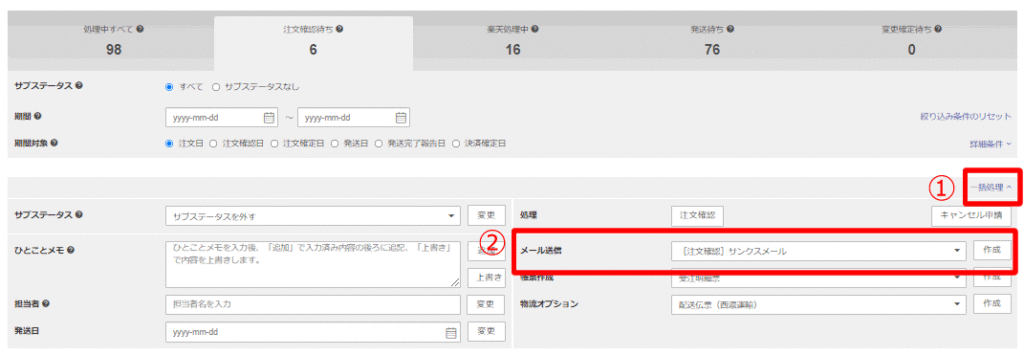 RMS内で設定するメールテンプレートを使って一括処理か注文詳細画面内で「発送通知」に関するメールを送ると、この請求処理が翌日早朝まで短縮化される傾向があるので、商品の出荷が完了したら、必ず伝票情報の反映と発送通知メールの送信をセットで行うようにしましょう。