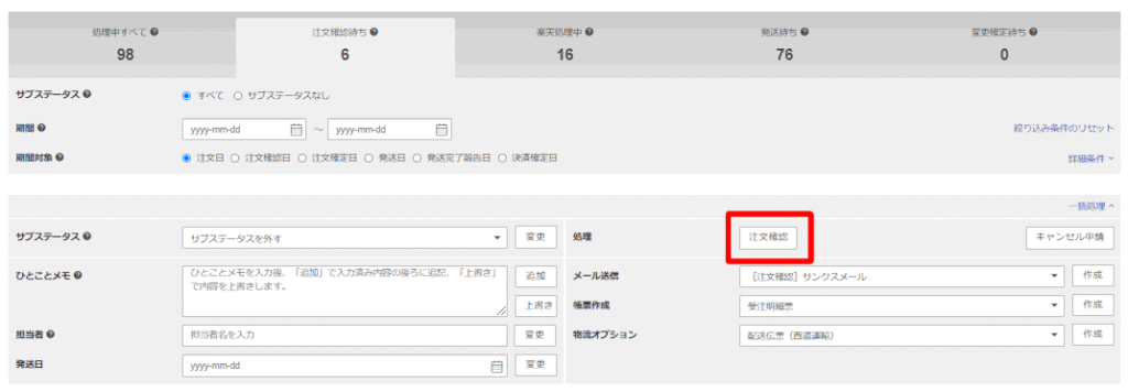 「発送待ち」ステータスにある注文情報はすべて決済が確定したものなので、「発送待ち」の注文分について出荷作業を行っていきます。